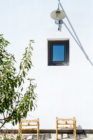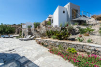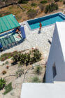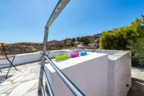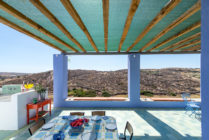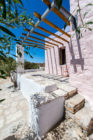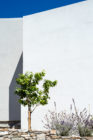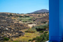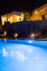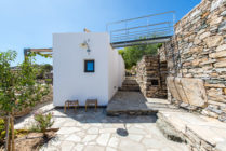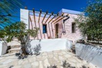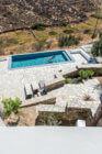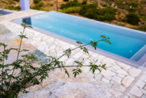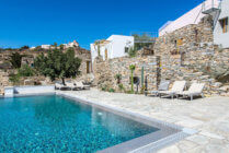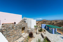 From afar, in the foothills of the village Faneromeni, twelve colorful cubes come into view. They are not an assortment of rose flavored or bergamot loukoums, Syros’s exquisite delights, only a bunch of dry-stone buildings, scattered around the hill, crowned with ultramarine terraces, indistinguishable from the sky. These buildings are clustered around a large rose-colored mansion. Could it be be Bernarda Alba’s house or Nora’s? The “Cherry Orchard” or maybe Blanche Dubois’ “Bel Rêve”? Why not “Marlinspike Hall” or “Yasnaya Polyana”, or even Marguerite Yourcenar’s hermitage, “La Petite Plaisance”? Under the endlessly blowing northerly winds we suggest the “Sanssouci” along with the “Wuthering Heights”. In any case the mansion serves as an acropolis, overseeing the estate and its surroundings: a small village with its own agora, assembly area, and aloni, threshing floor —a makeshift theatre and a space for dance, fun and games— a swimming pool for refreshing dips and the terraces overlooking the island’s valleys and hills, that reach out towards Tinos and Mykonos.