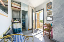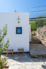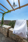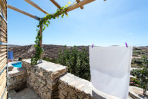 Balcony is full of greenery. The shady terrace under the jasmine and the vine overlooks the swimming pool and the foliage of the fig trees and the almond trees.